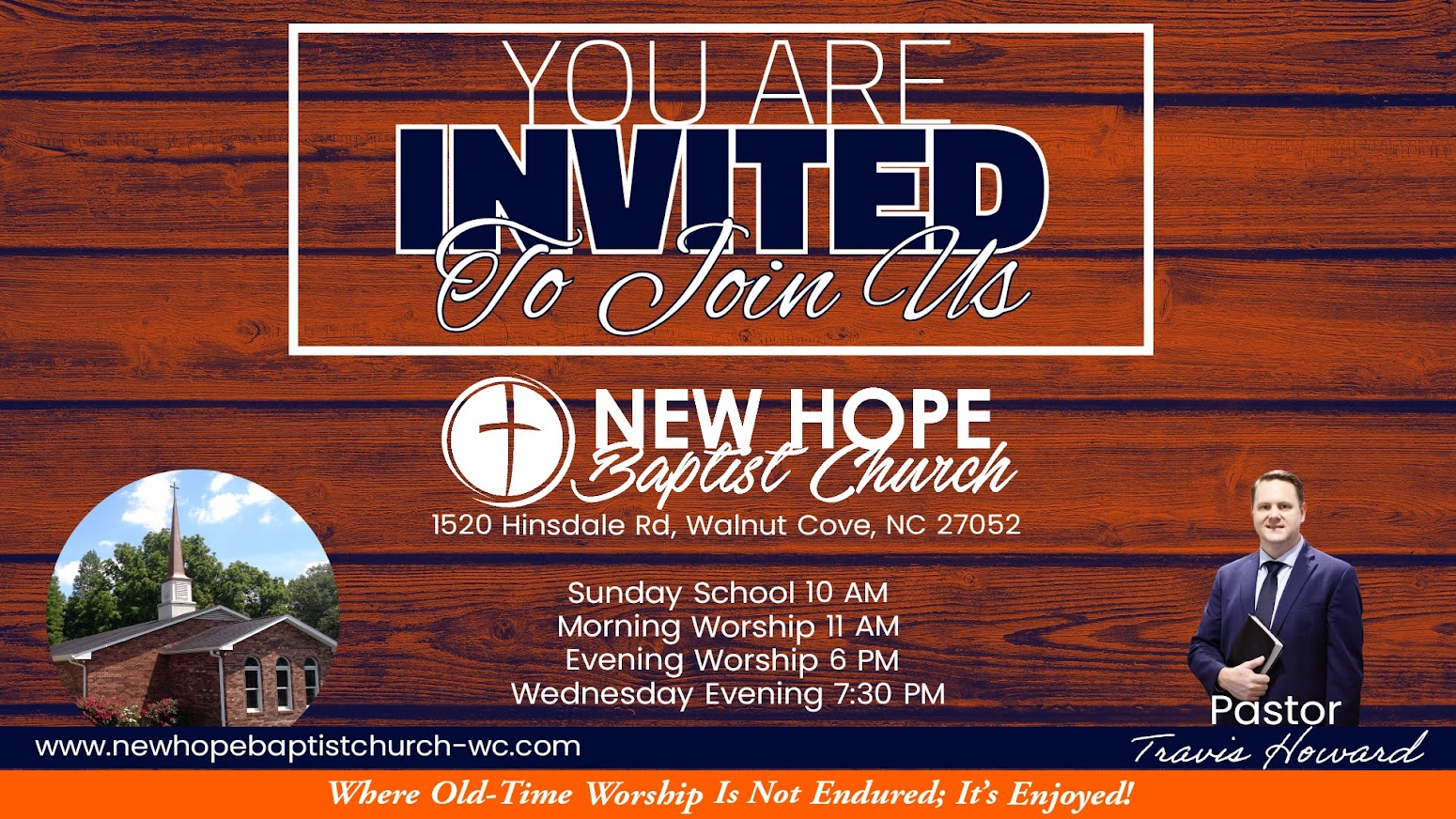 On behalf of our entire church family here at New Hope Baptist Church I would like to personally invite each and everyone to come visit us for one of our services sometime real soon!I believe you will find a warm, friendly atmosphere, and a wonderful place to Worship the Lord. I invite you to see for yourself - a church: "Where Old Time Worship Is Not Endured, It's Enjoyed!"We are excited about what God has done, what He is doing, and what He is going to do here at New Hope Baptist Church!We would Love to see you soon!Pastor Travis Howard